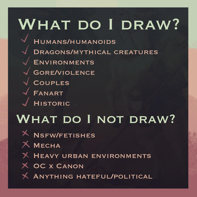 1. After the commission is completed, I will send you the full size image via email in .png format. You may also request a .psd of the commission.2. Up to 3 minor changes can be made for free after the commission is finished, but any medium-large changes may not be possible, or will incur an extra fee (see my TOS for details). I decide if a requested change is minor or medium/large.4. Speedpaints may or may not be included, and do not cost anything extra!4. Commissions will likely be posted on my social media a few days after completion.5. As the commissioner, you are free to post, upload, and use the finished commission as you please (while following my TOS).Don't be afraid to send me a message if you have any questions <3!